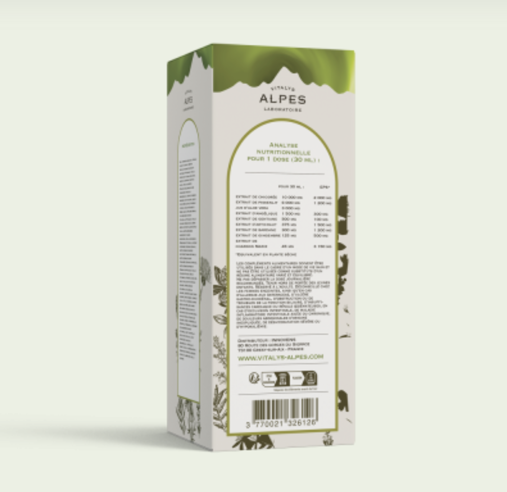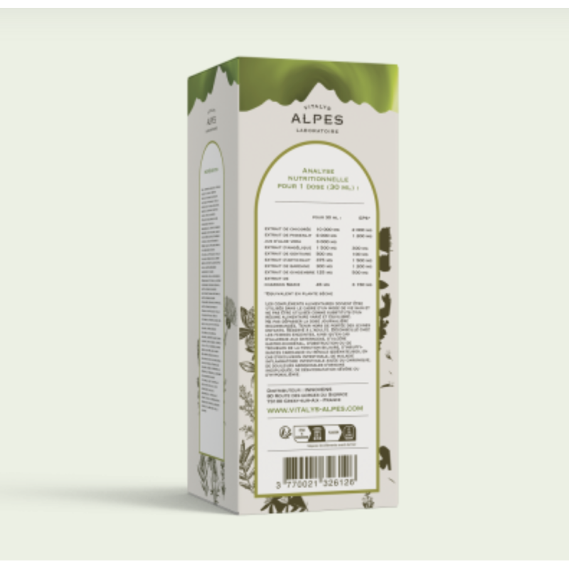 Eau ; extrait fluide de racine de chicorée ; extrait fluide de feuille de pissenlit ; jus d’aloe vera ; glycérine d’origine végétale ; extrait fluide de racine d’angélique ; extrait fluide de racine de gentiane ; extrait sec de feuille d’artichaut ; extrait sec de racine de bardane ; acidifiant : acide citrique ; arôme camphre ; extrait sec de rhizome de gingembre ; conservateurs : sorbate de potassium, benzoate de sodium ; épaississant : gomme de xanthane ; extrait sec de graine de chardon Marie.