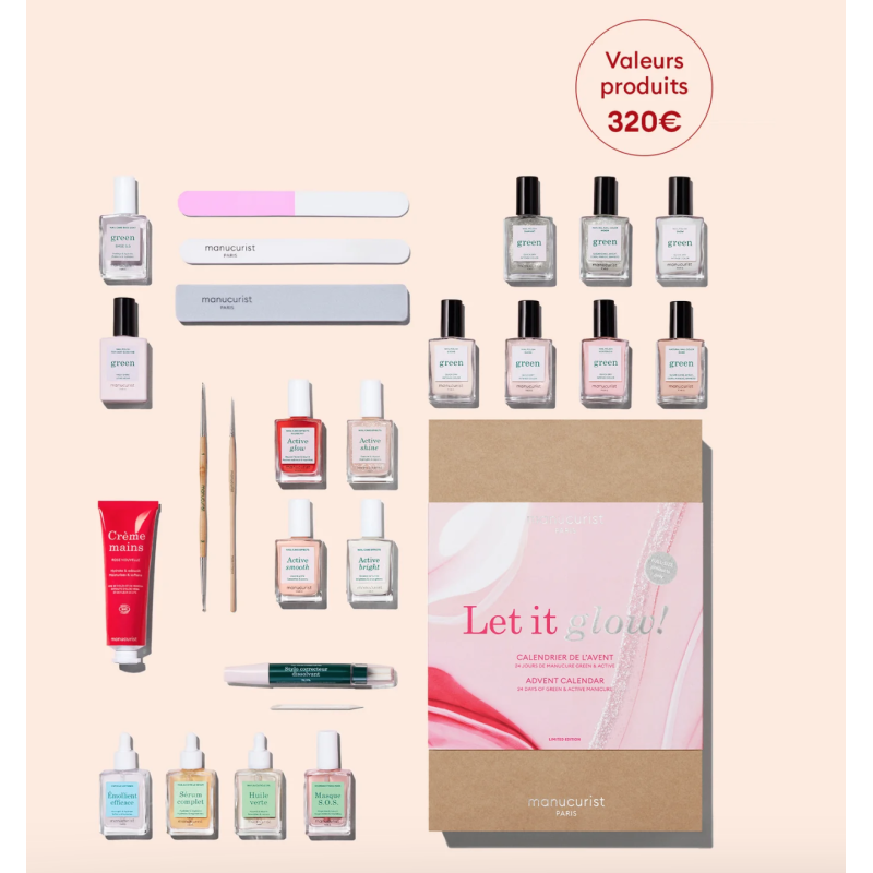 Découvrez le Calendrier de l'Avent "Let it Glow" de Manucurist : 24 produits FULL SIZE pour sublimer vos ongles et mains avec style et soin.