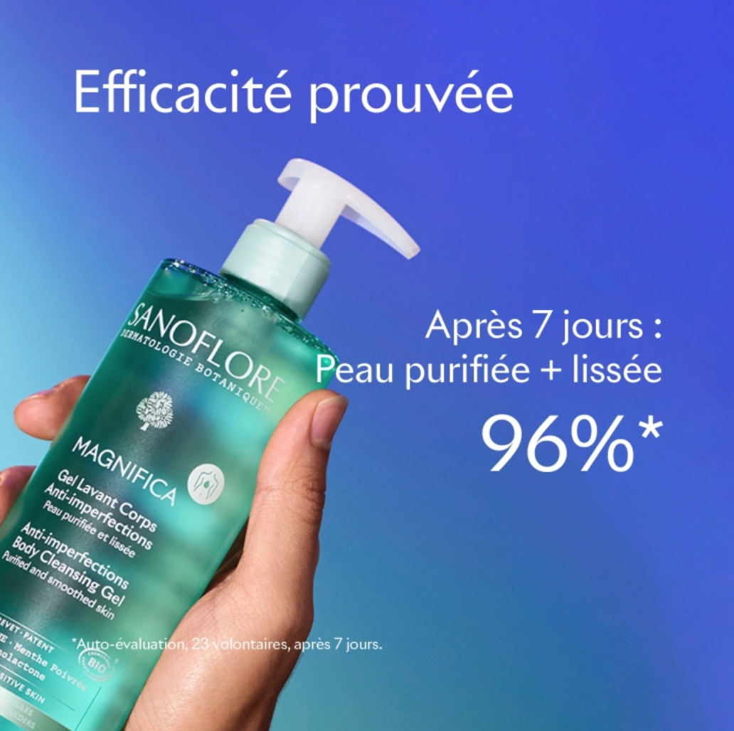 Le Gel Lavant Corps MAGNIFICA est un gel douche anti-imperfections qui cible le dos, décolleté, épaules et fesses pour une peau nettoyée, purifiée et lissée. Anti-marques + Anti-récidive (2 semaines après l’arrêt) Formule enrichie en : - Complexe MAGNIFICA breveté : puissant complexe purifiant de 9 huiles essentielles bio issu de 5 années de recherche à l'efficacité anti-imperfections brevetée - Menthe Poivrée : utilisation de l’ensemble des principes actifs de la menthe poivrée pour une efficacité antibactérienne et anti-inflammatoire. L’huile essentielle et l’hydrolat de menthe poivrée agissent contre les brillances, boutons et points noirs. - Gluconolactone : exfolie en douceur avec une action comédolytique. Bénéfices :  Le Gel Lavant Anti-imperfections certifié bio: Nettoie Purifie Lisse Protège Anti-marques Anti-récidive. Ingrédients INGREDIENTS : Aqua, Mentha Piperita Leaf Water*, Sodium Coco-Sulfate, Coco-Glucoside, Glycerin, Coco-Betaine, Gluconolactone, CYMBOPOGON SCHOENANTHUS OIL*, Rosmarinus Officinalis Leaf Oil*, Satureja Montana Oil*, Eugenia Caryophyllus Flower Oil*, Origanum Heracleoticum Flower Oil*, Cymbopogon Nardus Oil*, Thymus Vulgaris Flower/Leaf Oil*, Nepeta Cataria Oil*, Melissa Officinalis Leaf Oil*, Sodium Chloride, Citric Acid, Parfum, Benzyl Alcohol, CITRAL, limonene - 4910701010 *Ingrédient issu de l'Agriculture Biologique98% du total des ingrédients sont d'origine naturelle12% du total des ingrédients sont issus de l'Agriculture Biologique Les listes d’ingrédients entrant dans la composition des produits de notre marque sont régulièrement mises à jour. Avant d’utiliser un produit de notre marque- vous êtes invités à lire la liste d’ingrédients figurant sur son emballage afin de vous assurer que les ingrédients sont adaptés à votre utilisation personnelle