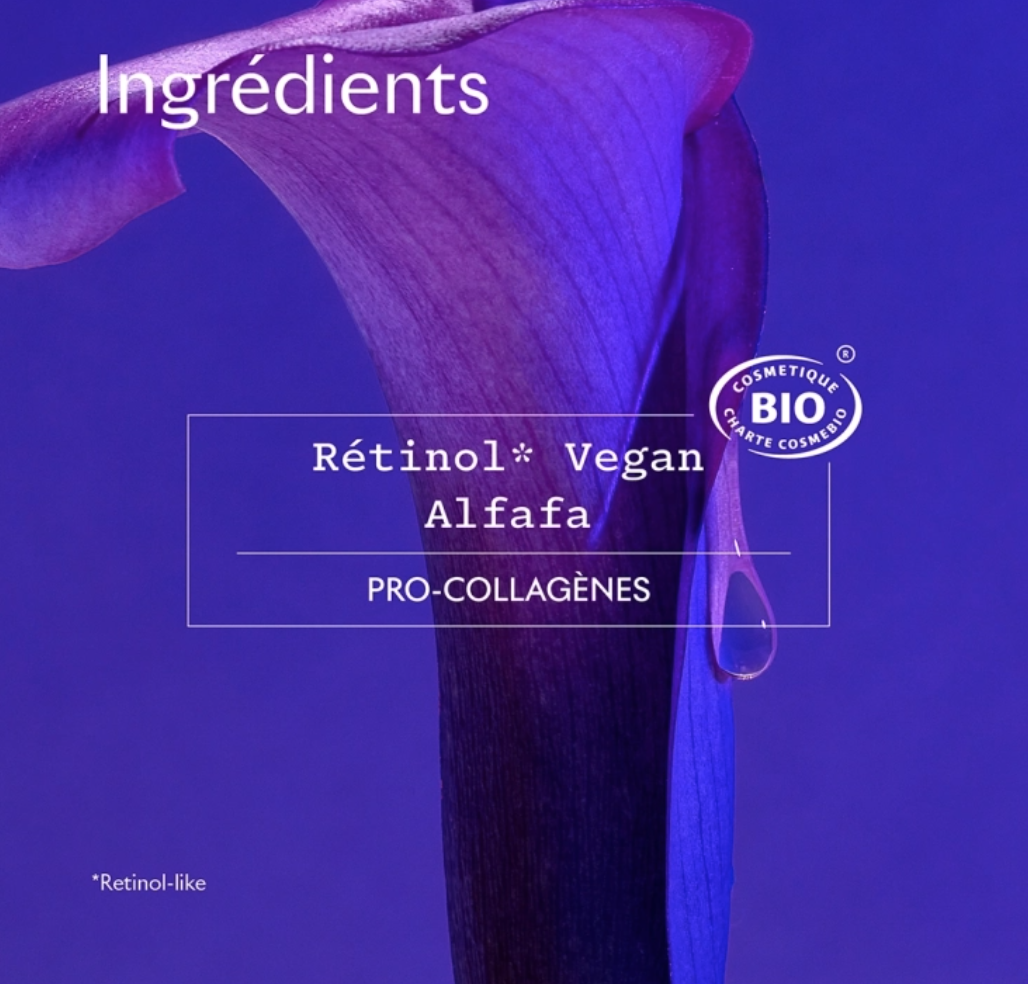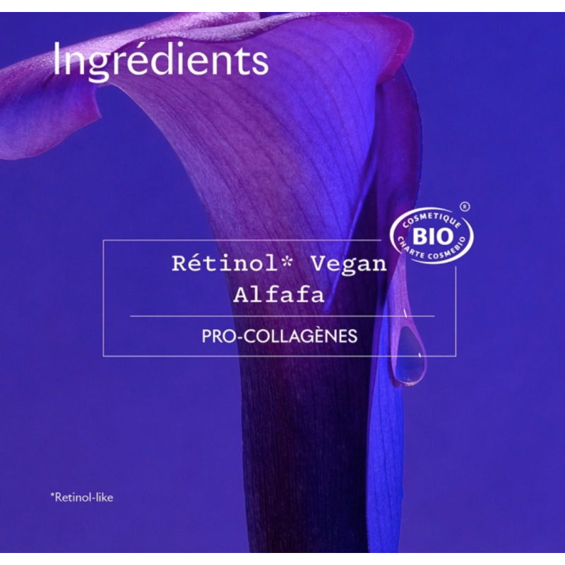 - Rétinol* vegan pro-collagènes : booste la production des Collagènes 1, 4 et 7 et favorise la réduction des rides