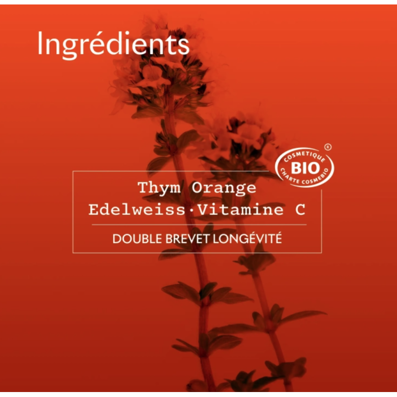 AQUA / WATER EauTHYMUS VULGARIS FLOWER/LEAF/STEM WATER - THYME FLOWER/LEAF/STEM WATER * Hydrolat de Thym Orange issu de l'agriculture biologiqueDICAPRYLYL ETHER Corps gras d'origine naturelleSIMMONDSIA CHINENSIS SEED OIL / JOJOBA SEED OIL * Huile de Jojoba issue de l'agriculture biologiqueCAPRYLIC/CAPRIC TRIGLYCERIDE Corps gras d'origine naturelleROSA DAMASCENA FLOWER WATER * Eau florale de Rose issue de l'agriculture biologiqueCETEARYL ALCOHOL Stabilisant d'origine naturelleGLYCERIN Hydratant d’origine naturellePROPANEDIOL Humectant d'origine naturelleGLYCERYL STEARATE CITRATE Emulsionnant d'origine naturelleGLYCERYL STEARATE Emulsionnant d'origine naturellePENTYLENE GLYCOL Co-conservateurBENZYL ALCOHOL ConservateurARGININE Acide aminé d’origine naturelle, issu de la fermentation du sucreGLYCERYL STEARATE SE Emulsionnant d'origine naturelleMICA NacreCITRIC ACID Stabilisant d'origine naturelleCI 77891 / TITANIUM DIOXIDE Pigment d'origine minéraleTOCOPHEROL Vitamine EPARFUM / FRAGRANCE Parfum d'origine naturelleXANTHAN GUM Gélifiant d'origine naturelleSALICYLIC ACID ConservateurCI 77491 / IRON OXIDES Pigment d'origine minéraleADENOSINE Actif anti-âge d'origine naturelleASCORBYL GLUCOSIDE Vitamine Cg, dérivé de Vitamine C d’origine naturelleLINALOOL Allergène naturellement présent dans les plantesSODIUM PHYTATE Stabilisant d'origine naturelleSILICA Poudre minérale/Agent absorbantHELIANTHUS ANNUUS SEED OIL / SUNFLOWER SEED OIL Huile de TournesolLIMONENE Allergène naturellement présent dans les plantesFAGUS SYLVATICA BUD EXTRACT * Extrait de bourgeon de hêtre issu de l'agriculture biologiqueCALCIUM PCA Humectant d'origine naturelleCITRONELLOL Allergène naturellement présent dans les plantesTHYMUS VULGARIS FLOWER/LEAF OIL - THYME FLOWER/LEAF OIL * Huile essentielle de Thym Orange du Vercors issu de l'agriculture biologiqueBENZOIC ACID ConservateurGERANIOL Allergène naturellement présent dans les plantesCITRAL Allergène naturellement présent dans les plantesSORBIC ACID ConservateurEUGENOL Allergène naturellement présent dans les plantesALCOHOL AlcoolBENZYL BENZOATE Allergène naturellement présent dans les plantesLEONTOPODIUM ALPINUM FLOWER/LEAF EXTRACT* Extrait d’Edelweiss issue de l’agriculture biologiqueSODIUM BENZOATE ConservateurPOTASSIUM SORBATE Conservateur.