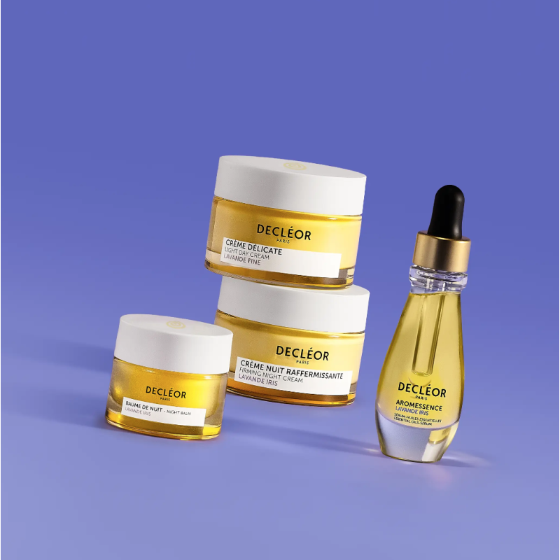 Huile essentielle de Lavande Fine & extrait d’Iris : favorisent la synthèse de collagène et d'élastine pour raffermir & lisser