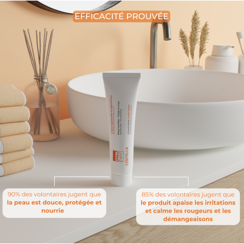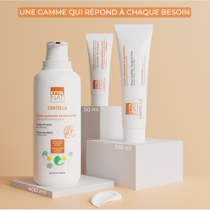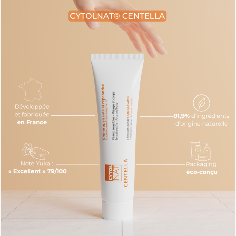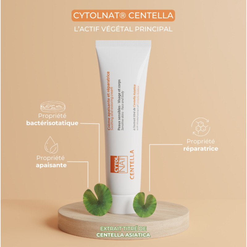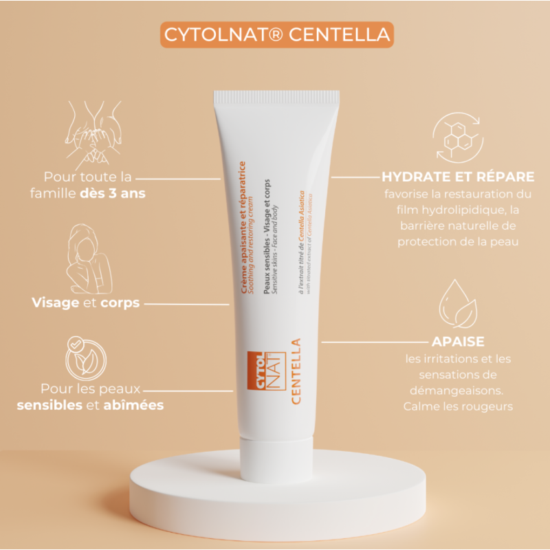 La crème apaisante et réparatrice Cytolnat® Centella est utilisée pour accélérer la reconstruction des peaux abîmées, agressées et fragilisées de toute la famille dès 3 ans.