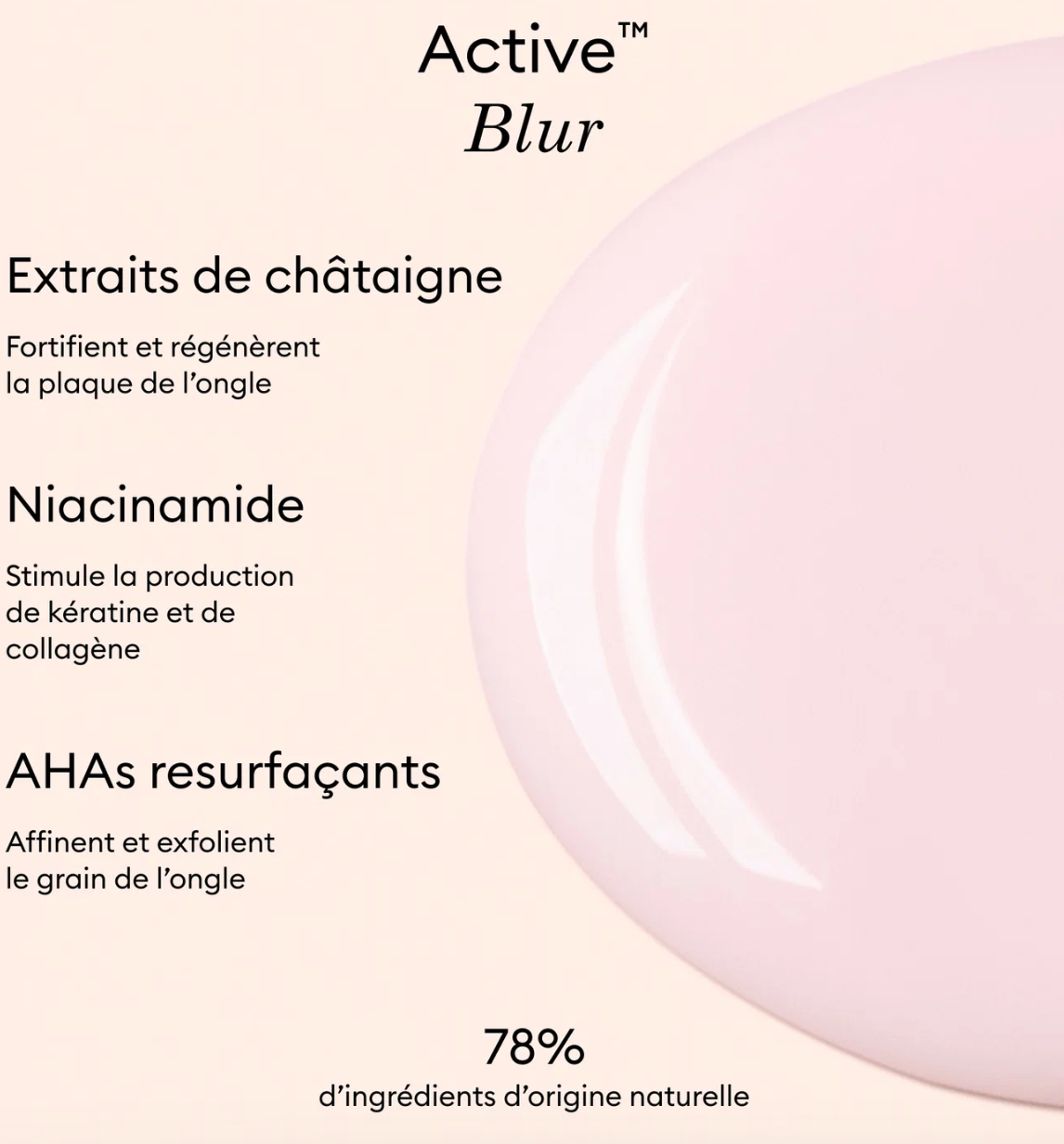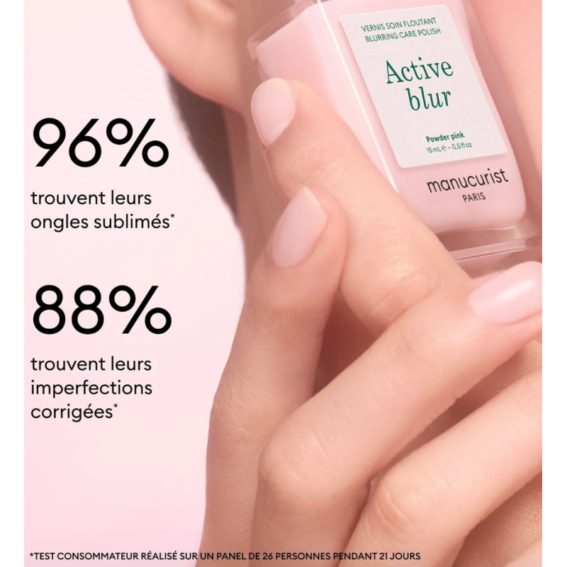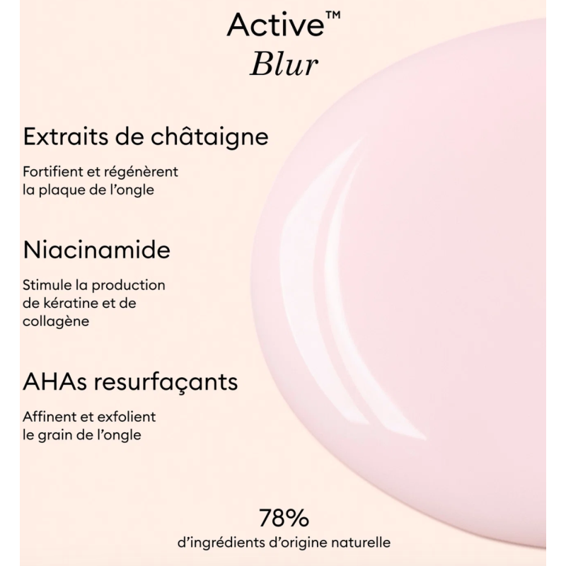 Appliquez Active™ Blur sur ongle nu, sans Base Coat ni Top Coat, puis laissez sécher à l'air libre.Son fini make-up est modulable :
