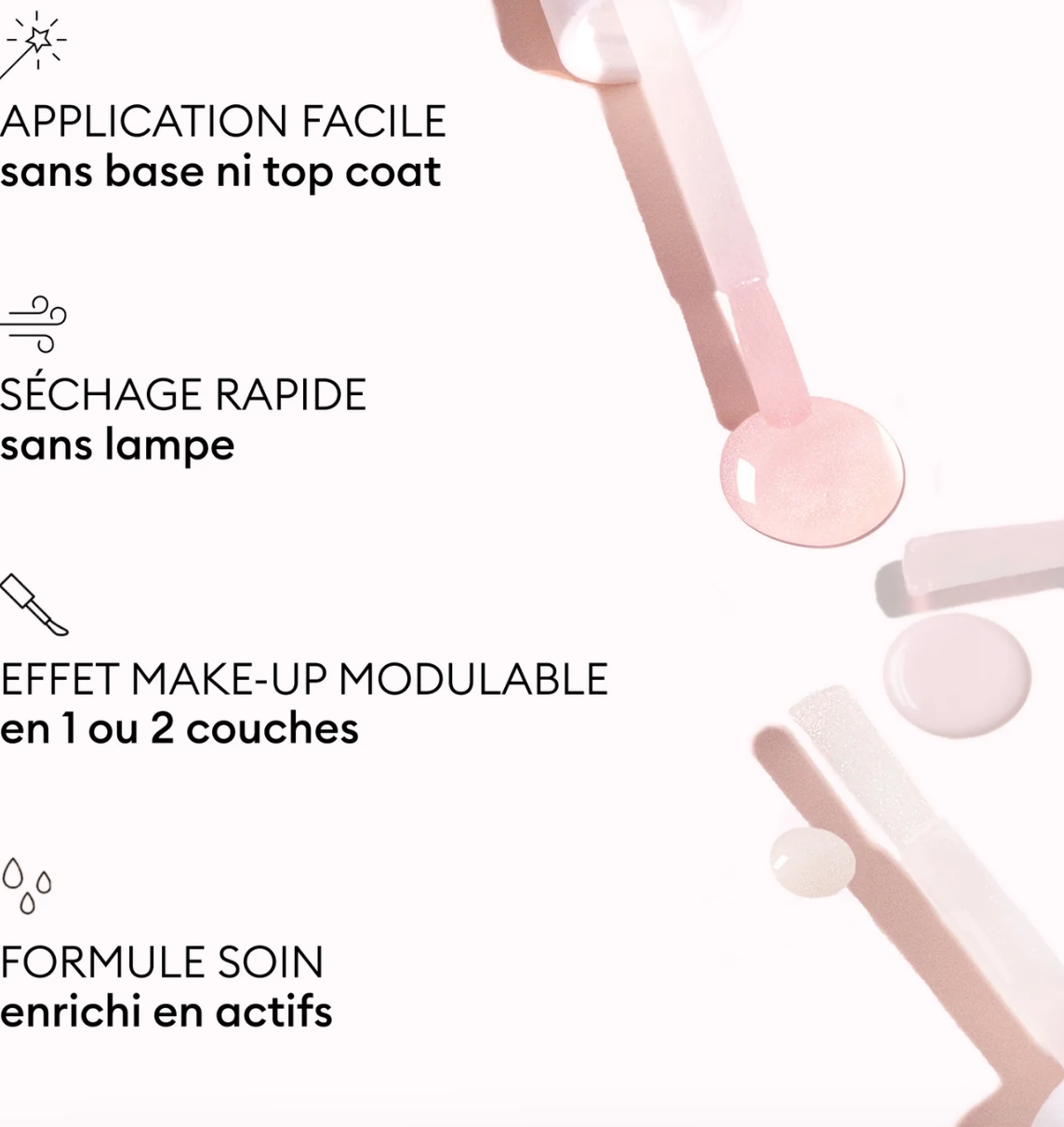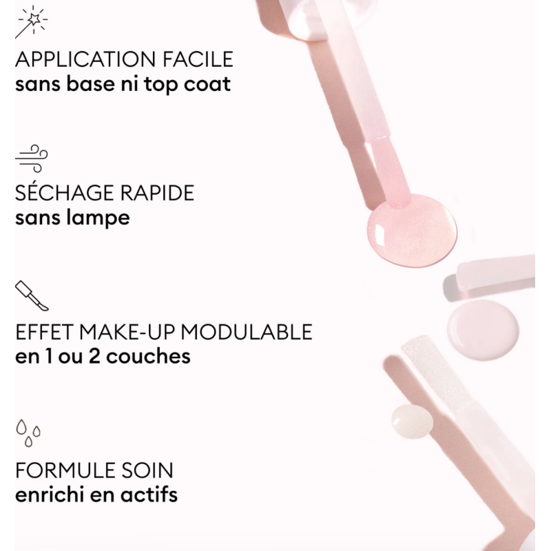 Application facileS’applique directement sur ongle nu, sans Base Coat ni Top CoatSéchage express à l’air libreTenue jusqu’à 7 jours avec fini mat veloutéEffet make-up modulableFini rose poudré mat et velouté, qui masque les imperfectionsRésultat floutant immédiat, comme un filtre embellisseurIntensité modulable selon l'effet souhaité : 1 à 2 couches pour un rendu sur mesureFormule soin brevetée :Une synergie brevetée d’actifs ciblés pour visiblement renforcer et lisser la plaque de l’ongle :